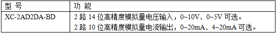 XC系列PLC適配左擴展BD板,包含2點AD輸入、2點DA輸出。