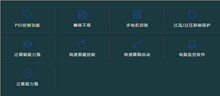 ④先進(jìn)的電機(jī)控制算法,無(wú)編碼矢量控制(SVC)時(shí)零速力矩達(dá)150%以上;